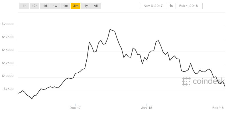 coindesk-bpi-chart ← Poprzednie Następne → wykres zmiany ceny Bitcoina wobec USD w okresie listopad 2017 – luty 2018; źródło: www.coindesk.com