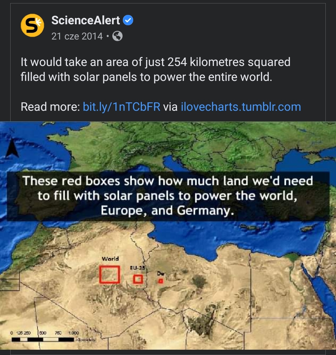 Wg obrazka zaledwie tak niewielką powierzchnię potrzeba (w Afryce Północnej gdzie dominuje pustynny klimat), by postawione tam panele fotowoltaiczne zasiliły prądem cały świat.